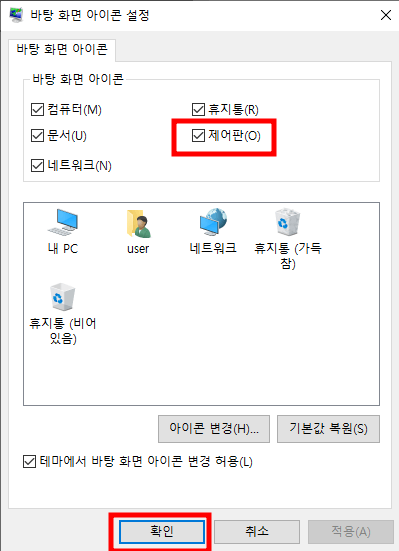 바탕화면 아이콘 설정을 클릭하면 바탕화면에 만들수 있는 컴퓨터, 휴지통, 문서, 제어판, 네트워크 5개가 보인다. 지금 보이는 것은 5개 모두 체크가 되어 있는데 이것은 바탕화면에 5개 모두 만들어져 있다는 의미이다. 제어판을 만들기를 원했다면 제어판에는 체크 없을 것이므로 이곳을 체크하고 확인을 클릭하면 바탕화면에 제어판 기본 아이콘이 생성된다. 이렇게 제어판 아이콘을 바탕화면에 만들어지게 된다.